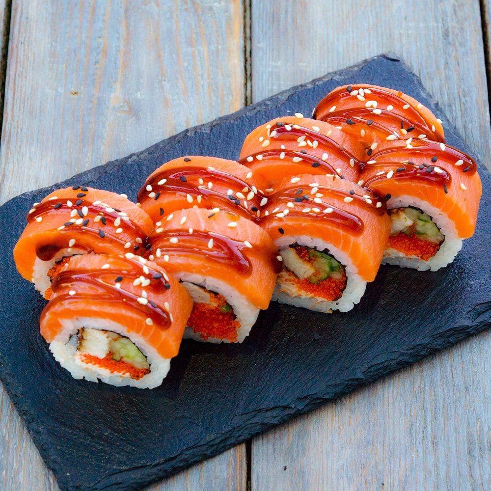 Лосось, угорь, сыр cremette, икра летучей рыбы, огурец, соус унаги, рис, нори