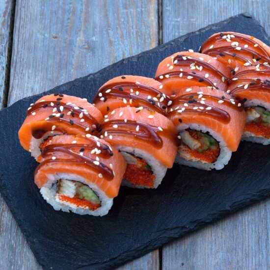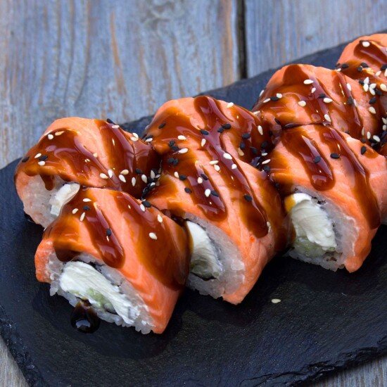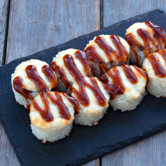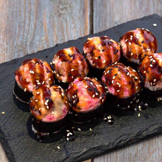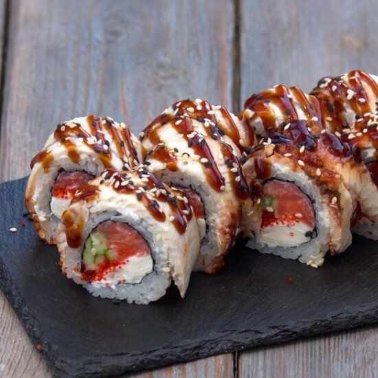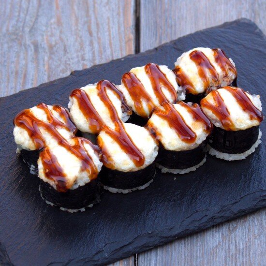 Краб, сыр cremette, икра летучей рыбы, огурец, спайси соус, соус унаги, рис, нори